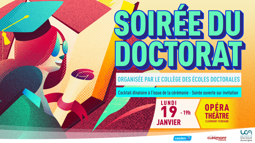 La Cérémonie de remise des écharpes doctorales de l’Université Clermont Auvergne, organisée par le Collège des Ecoles Doctorales en partenariat avec Clermont Auvergne Métropole, la ville de Clermont-Ferrand et la CASDEN se tiendra le lundi 19 janvier 2026 à 19h00 à l'opéra de Clermont-Ferrand. Les docteurs diplômés en 2025 des 5 Écoles Doctorales seront conviés, ainsi que leurs Directeurs de thèse et proches, et de nombreuses personnalités (officiels, entreprises) -
